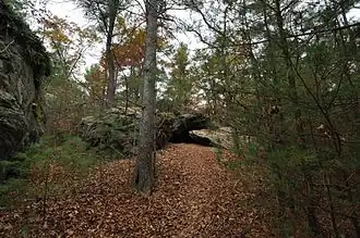 King Philip's Cave is a cave in Norton, Massachusetts near Lake Winnecunnett. It may be accessed from Stone Run Drive off Plain Street near Bay Road and sits on a 7-acre (28,000 m2) parcel of land owned by the Land Preservation Society, an independent non-profit conservation organization chartered in 1970 by the State of Massachusetts.[1]