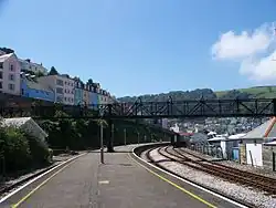 The railway originally approached the station across three creeks on low timber viaducts. Those at Longwood and Noss being demolished after the line was moved inland around the creeks on 20 May 1923, and Hoodown Viaduct, just outside the station, was replaced by a double-track steel structure in 1928. This and the provision of a larger turntable enabled larger locomotives to work through to Kingswear. The platform was extended in 1929 to 850 feet (259 m) which allowed longer trains too.