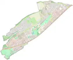 The major components of Kirchberg's urbanisation were drawn up by French architect Pierre Vago, with its central axis being the 3.5 km long Avenue John Fitzgerald Kennedy stretching from the Grand Duchess Charlotte Bridge in southwest Kirchberg to the edge of the Grünewald forest on the north-eastern border.[7] The avenue was beautified from its original inception as an expressway into a tree-lined pedestrian-and-cycle-friendly thoroughfare, with separated tram and bus lanes. The Kirchberg campus of the University of Luxembourg is located midway along this avenue, in proximity to, since September 2019, the National Library of Luxembourg. A number of glass and steel edifices of commercial, and financial institutions spans from central to north eastern Kirchberg, where the Kirchberg Hospital is located.