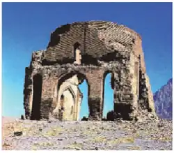 Kirna mausoleum is a square-shaped building with a cupola and, apparently, a fragment of the whole complex. Remains of muqarnas composition in the northern part of the monument and elements of the interior of an attached area testify to it. The monument belongs to tower-shaped monuments of the architectural school of Nakhchivan. One-celled mosques with dome also have such an architectural planning. But there is not any trace of mihrab. The general view of the mausoleum gives a cause that it was either a mausoleum or a mosque. The mausoleum is similar to Khanegah on the coast of the Alinjachay River because it also was built of burned brick, has a cupola and a square foundation of the cupola. The external parts of both mausoleums are pyramid-shaped with 16 faces. Muqarnas in the southern part of Kirna mausoleum testifies that the only part of the mausoleum saved till our days consisted only one part. It is difficult to determine the construction date of the monument because the ligature on it is destroyed. According to architectural features, the building can be dated to the 13th century.[2]
