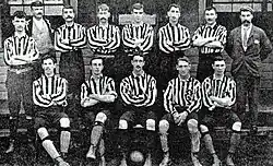 The first standard strips emerged with the founding of the FA, the Football Association's initial minutes recording some of the club colours, such as the Royal Engineers A.F.C.'s red and blue, and Lincoln's white jerseys with red, white, and blue caps.[41] Many clubs opted for colours associated with the schools or other sporting organisations from which the clubs had emerged.[7] Blackburn Rovers, for example, adopted shirts of a halved design based on those of the team for former pupils of Malvern College, one of the schools where the sport had developed. Their original colours of light blue and white were chosen to reflect an association with Cambridge University, where a number of the club's founders had been educated.[42] Colours and designs often changed dramatically between matches, with Bolton Wanderers turning out in both pink shirts and white shirts with red spots within the same year.[43] Rather than the modern shorts, players wore long knickerbockers or full-length trousers, often with a belt or even braces.[44] Lord Kinnaird, an early star of the game, was noted for always being resplendent in long white trousers.[45] There were no numbers printed on shirts to identify individual players, and the programme for an 1875 match between Queen's Park and Wanderers in Glasgow identifies the players by the colours of their caps or stockings.[46] The first shin pads were worn in 1874 by the Nottingham Forest player Sam Weller Widdowson, who cut down a pair of cricket pads and wore them outside his stockings. Initially the concept was ridiculed but it soon caught on with other players.[47] By the turn of the century pads had become smaller and were being worn inside the stockings.[48]