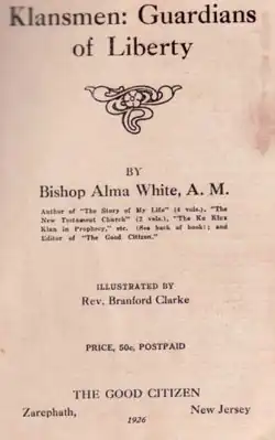 Klansmen: Guardians of Liberty was a book published by the Pillar of Fire Church in 1926 by Bishop Alma Bridwell White and illustrated by Branford Clarke.[1] She claims that the Founding Fathers of the United States were members of the Ku Klux Klan, and that Paul Revere made his legendary ride in Klan hood and robes.[2] She said: "Jews are everywhere a separate and distinct people, living apart from the great Gentile masses ... they are not home builders or tillers of the soil."[3][4] Her book, which contains many anti-Catholic themes, became popular during the United States presidential election of 1928 when Al Smith was the first Catholic presidential candidate from a major party.[5]