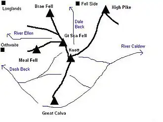 From the south of the summit a ridge descends across a narrow col to the neighbouring fell of Great Calva. A further spur on this flank, across to the east, is named Snab. Wiley Gill and Burdell Gill fall on this side to the River Caldew and, ultimately, the Eden at Carlisle.