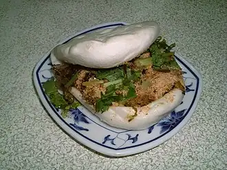 Koah-pau or gua bao[1] or cuapao[2][3] also known as a pork belly bun,[4] ambiguously as bao,[5][6] or erroneously as bao bun,[7][8] is a type of lotus leaf bun originating from Fujianese cuisine in China.[9] It is also a popular snack in Taiwan, Singapore, Malaysia, Philippines, and Nagasaki Chinatown in Japan.
