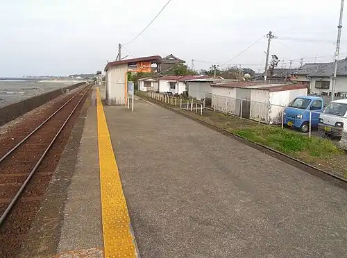 The station is on the ground level with one side platform. It is an unattended station with no station building. There is a waiting room in the middle of the platform, with a level crossing (without barriers or alarms) south to the outside of the station. There are two bicycle parking lots on either side of the exit to the level crossing, and six sheds used for track maintenance. are located on the south side of the station and to the east of the bicycle parking lot. The north side of the station faces the Ariake Sea.[1][2]