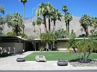 The house is a fine example of the residences that master architect E. Stewart Williams designed between 1947 and the end of the 1960s.[2] The single-story structure features a shed roof, deep overhangs, and large glass surface areas with sliding glass doors that facilitate its indoor-outdoor flow. He also integrated natural wood that was utilized for its post-and-beam construction, board-and-batten cladding, interior cabinets, closets and built-in furniture. The landscaping was designed by Eckbo, Royston and Williams. The house was listed on the National Register of Historic Places in 2016.[1]