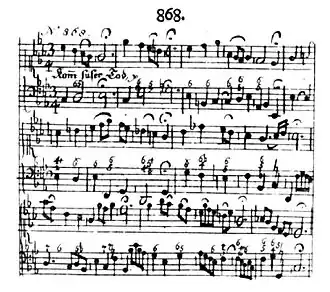 "Komm, süßer Tod, komm selge Ruh" (Come, sweet death, come, blessed rest) is a song for solo voice and basso continuo from the 69 Sacred Songs and Arias that Johann Sebastian Bach contributed to Musicalisches Gesang-Buch by Georg Christian Schemelli (BWV 478), edited by Schemelli in 1736.[1] The text is by an anonymous author.[2] Bach, by means of melody and harmony, expresses the desire for death and heaven. It is among his most popular works and has been adapted and transformed by several composers, such as Max Reger, Leopold Stokowski,[3] Knut Nystedt, and for the Wanamaker Organ, by Virgil Fox.[4]