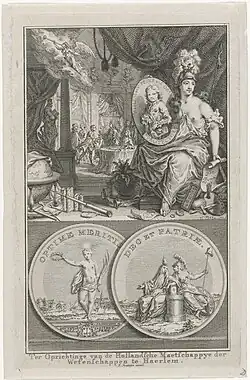 The society started as a gentleman's club that met in the Haarlem City Hall to discuss science topics and promote the study of the arts and sciences. They pooled resources to purchase books and specimens for study, which were kept in the town hall until they purchased a building on the Grote Houtstraat (nr. 51, since unrecognizably rebuilt), where the curator of the collection lived. Under the direction of Martin van Marum, a proper museum was established with zoological specimens located there on display for the public, as a forerunner of the modern Naturalis in Leiden.[1] Van Marum also kept a small garden for public viewing in the summer months, filled with special plants, located in the Bakkerstraat. The museum fell out of favor after Van Marum's death, and it was dissolved in 1866.