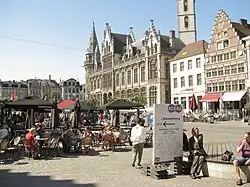 The Korenmarkt (Dutch pronunciation: [ˈkoːrəmɑr(ə)kt]; "Wheat Market") is a city square in the historic centre of Ghent, East Flanders, Belgium. Located between the Leie river and St. Nicholas' Church, it is one of the city's most important and famous tourist locations. The square is surrounded with several historic buildings, which today house bars, restaurants and terraces.[1] It is a pivotal location of the annual Gentse Feesten cultural festival.