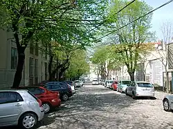 First phase, which included streets and façades, began on 7 September 2016. The works were styled "historical" by the city authorities, though they indeed were overdue.[60] The phase was to be finished in February 2017, but as of May works were not even close to ending, with the streets being dug out, the buildings being covered in nylons and scaffolds and the entire neighborhood being noisy and covered in dust for months. Newspapers described Kosančićev venac as the "horror movie scenery", "ghostly" or looking like "during the World War II".[14][61] In June 2017, city urbanist Milutin Folić, announced that the façades will be finished in July, kaldrma only by the end of the year, the library will be revitalized in 2018 and when that is finished, the gallery will be built.[41] In August 2017 the deadline for façades was moved to November, to be finished concurrently with kaldrma, which is being arranged according to the plans from 1903.[62] However, as of February 2018, the troubled project is not yet finished, while architects denounced the quality of the works. The criticism include: frequent pauses and overall length of the works, disappearance of the original kaldrma from some parts of the street, general sloppiness and bad quality, bad leveling and height of the drains which cause formation of the ponds during the rain, several digging ups of the same sections, hodgepodge of the materials used, removal of some trees but not planting any new ones, low quality of the façades which are already cracking, etc.[63] The reconstruction was officially declared finished on 25 February 2018.[64] Architect and resident of Kosančićev Venac, Cecilija Bartok, criticized every aspect of the reconstruction (narrowing of the street, change of the materials, displacement of the sewage, incompetence of the workers) stating that the only work that really had to be done was reconstruction of the façades. She asserted that the entire neighborhood lost its authenticity and that it is devoid of its charm.[65]