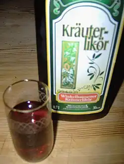 Kräuterlikör (German: [ˈkʀɔɪtɐlikøːɐ] ) (herbal liqueur or spiced liqueur) is a type of liqueur that is flavored with herbs or spices and is traditionally drunk neat or on ice as a digestif, which is very similar to the concept of an Italian amaro. A distinction is made between sweet herbal liqueur, Halbbitter (half-bitter) and Bitter (or Kräuterbitter). Herbal bitters are produced all over the world, and many regions in Germany have their own specialties.