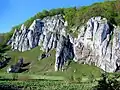 The Polish Jura consists of a hilly landscape with Jurassic limestone rocks, cliffs, valleys and vast limestone formations, featuring some 220 caves. The relief of the upland developed since the Paleogene, under climatic conditions changing considerably. Its main component is a peneplain, crowned by monadnocks, rocky masses that resisted erosion, generated as hard rock on Late Jurassic buildup surrounded by less resistant bedded limestone of the same age.[1] The Polish Jura is visited by roughly 400,000 visitors a year. Part of it belongs to the Ojców National Park, the smallest of Poland's twenty national parks, ranking among the most attractive recreational areas of the country.[2]