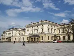 The railway station was situated in a historical building, constructed between 1844 and 1847 by Rosenbaum, which lies parallel to the tracks. The design was chosen to allow for future line expansion. The station was initially a terminus of the Kraków – Upper Silesia Railway (Kolej Krakowsko-Górnośląska, German: Oberschlesische-Krakauer Eisenbahn). Trains entered the trainshed via a brick archway at the northern end of the station which was almost doubled in size in 1871.[1] In 2014, a new building was opened.
