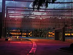 The 2003 artwork Dreaming in Color by Leni Schwendinger features programmed lighting projected toward the scrims.[11][12] The "three-dimensional environmental installation" has been used for special occasions; for example, teal lighting was used during September 2013 to commemorate National Ovarian Cancer Awareness month.[13] The promenade was illuminated blue in 2020, during the COVID-19 pandemic, to commemorate first responders and health care workers.[14] The work measures 45 x 30–50 x 150 feet (13.7 x 9.1–15.2 x 45.7 m).[15]