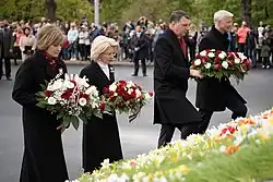 Prime Minister Krišjānis Kariņš along with President Raimonds Vējonis, Speaker of the Saeima Ināra Mūrniece and Chief Justice of the Constitutional Court Ineta Ziemele taking part on 4 May 2019 event to celebrate the restoration of Latvian independence in 1990