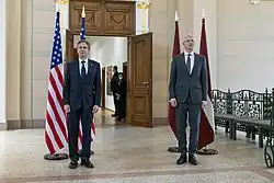 Like his predecessors, Kariņš has stressed a commitment to a western-oriented foreign policy and has expressed caution regarding Russia's foreign policy intentions.[62] On 7 January 2019, he announced that fellow party member Edgars Rinkēvičs, who had already at the time been Latvia's longest-serving foreign minister and had worked under prime ministers Valdis Dombrovskis, Laimdota Straujuma, and Māris Kučinskis, would continue in his current role.[63] On 8 February, he made his first foreign visit to the neighboring country of Estonia, stressing the importance of relations between the two nations.[64]