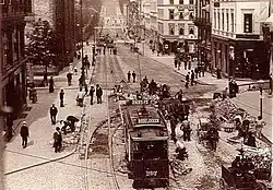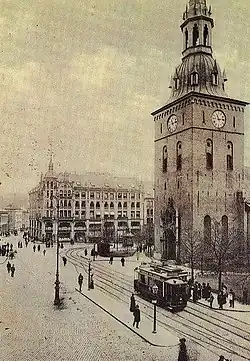 By the late 1890s Oslo had three private tram companies, of which two, Kristiania Sporveisselskab and Kristiania Elektriske Sporvei, operated each their network of street trams.[1] This led to a debate of whether tram operation should be a private or a municipal affair. The two dominant parties too each their stand: the Conservative Party wished to retain the private operations, while the Liberal Party supported a municipalization of the operations.[2] The issue was split: Oslo Municipality taking over the existing two companies and establishing a new company to operate new lines. The municipality had in 1896 been offered to purchase KSS for its nominal share value plus interest in a move initiated by the tram company itself. Its main concern was its concession would expire in 1905 and that the municipality would then have the right expropriate it. Meanwhile, the company was in need of new capital and offered to issue new shares to the municipality.[3] Oslo Municipality rejected the offer and the new shares were instead sold to Gesellschaft für elektrische Unternehmungen of Berlin.[2]