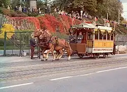 During its period of horsecar operations, KSS took delivery of 57 units. These are subdivided into three classes, each manufactured by a different company and with distinct specifications. After the closing of the horsecar network, thirty-eight units were converted to trailers for electric trams.[37] The first class was built by John Stephenson Company and consisted of twenty-nine units delivered in 1875 and 1877. They were 4.1 meters (13 ft) long and 2 meters (6 ft 7 in) wide. They weighed 1.8 tonnes (1.8 long tons; 2.0 short tons) and were bidirectional, allowing seating for fourteen seated passengers.[1]