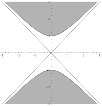 The event horizons bounding the black hole and white hole interior regions are also a pair of straight lines at 45 degrees, reflecting the fact that a light ray emitted at the horizon in a radial direction (aimed outward in the case of the black hole, inward in the case of the white hole) would remain on the horizon forever. Thus the two black hole horizons coincide with the boundaries of the future light cone of an event at the center of the diagram (at T=X=0), while the two white hole horizons coincide with the boundaries of the past light cone of this same event. Any event inside the black hole interior region will have a future light cone that remains in this region (such that any world line within the event's future light cone will eventually hit the black hole singularity, which appears as a hyperbola bounded by the two black hole horizons), and any event inside the white hole interior region will have a past light cone that remains in this region (such that any world line within this past light cone must have originated in the white hole singularity, a hyperbola bounded by the two white hole horizons). Note that although the horizon looks as though it is an outward expanding cone, the area of this surface, given by r is just , a constant. I.e., these coordinates can be deceptive if care is not exercised.