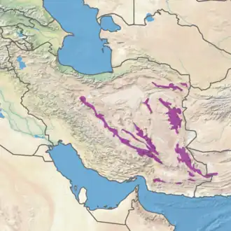The ecoregion extends for over 800 km along the mountain ridges of the Central Iranian Range, which runs northwest to southeast along western edge of the Iranian Plateau, and along a series of ranges on the eastern side of Iran and a small extension into Pakistan.[4] The mean elevation is 1,788 metres (5,866 ft), with a minimum of 594 metres (1,949 ft) and a maximum of 4,318 metres (14,167 ft).[1] Peaks include Kuh-e-Kargiz (3,890 m) and Shir Kuh (4,075 m) in the Central Iranian Range, and the volcanic peaks Bazman (3,489m) and Taftan (4,042 m) in the southeast.[2] At lower elevations the region transitions into the Central Persian desert basins ecoregion, which includes the Dasht-e Lut desert basin between the Central Iranian Range and the eastern ranges. The Registan–North Pakistan sandy desert ecoregion lies in the Sistan Basin east of the eastern ranges. In the south, the lower and drier elevations are in the South Iran Nubo-Sindian desert and semi-desert ecoregion.