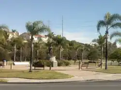 A statue of Christopher Columbus in the park was vandalized in February, 2019, with red paint splattered on it and graffiti. A bronze plaque previously attached to the statue had been stolen.[3] The statue was put in storage in June 2020 in anticipation of a George Floyd protest.[4] On May 25, 2021, the city voted to permanently remove it.[5]