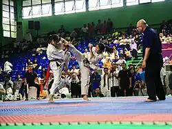 Kumite (Japanese: 組手, literally "grappling hands") is one of the three main sections of karate training, along with kata and kihon. Kumite is the part of karate in which a person trains against an adversary.[1]