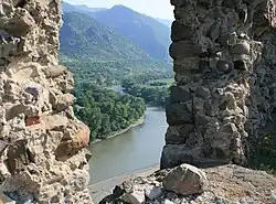 It rises in northeastern Turkey in a small valley in the Kars Upland[13] of the Lesser Caucasus. It flows west, then north and east past Ardahan, and crosses into Georgia. It arcs to the northwest, then into a canyon near Akhaltsikhe where it starts to run northeast in a gorge for about 75 kilometres (47 mi), spilling out of the mountains near Khashuri. It then arcs east before flowing east-southeast for about 120 kilometres (75 mi), past Gori, then near Mtskheta, flows south through a short canyon and along the west side of T'bilisi, the largest city in the region. The river flows steeply southeast past Rustavi and turns eastward at its confluence with the Khrami, crossing the Georgia-Azerbaijan border and flowing across grasslands into Shemkir reservoir and then Yenikend reservoir.[14]