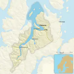 The landscape of today was largely formed during the last ice age. When the ice retreated, the terrain rose by 50 metres (164 ft). It is in this belt of old seabed that today's best farm land is located. There are four county roads connecting the municipality: two to the north and one each to the east and south. The highest point in the municipality is the 1,117.38-metre (3,665.9 ft) tall mountain Tverrelvtindan.[1] The 412-metre (1,352 ft) tall mountain Nupen is located in the northern part of the municipality on the border with Harstad.