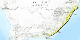 The Kwazulu-Cape coastal forest mosaic occupies the humid coastal strip between the Indian Ocean and the foothills of the Drakensberg mountains. It is part of a strip of moist coastal forests that extend along Africa's Indian Ocean coast from southern Somalia to South Africa. The northern limit of the ecoregion is at the St. Lucia estuary in KwaZulu Natal, where the forests transition to the Maputaland coastal forest mosaic. The southern limit is at Cape St. Francis, east of Port Elizabeth in the Eastern Cape Province, where the KwaZulu-Cape forests transition to the Albany thickets.[1][5]