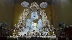 The Kyauktawgyi Buddha is a huge sculpted image of the Buddha seated in the Bhūmipassa Mudrā (ဘူဖဿမုဒြာ).[1] The figure was sculpted from a single block of pale green marble quarried at Sagyin, 12 miles (19 km) north of Mandalay.[1] The stone block was transported over the course of 13 days, requiring the manpower of 10,000 to 12,000 men, to the temple site, where it was carved. The image was consecrated in 1865.[1]