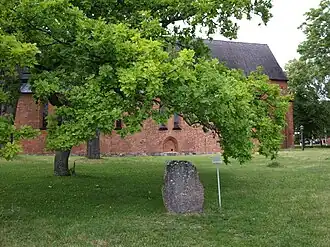 U 381 is the designation for a runestone that is part of the outer wall of the Gerner family mausoleum near St. Mary's Church. Before the historical significance of runestones was understood, they were often re-used as materials in the construction of roads, bridges, and buildings like churches. The inscription on this stone is partial and only a few words that are part of a prayer can be clearly read.