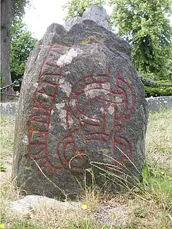 The runic text indicates that the stone was a memorial raised by members of a mercantile guild in memory of one of their members named Þorkell. U 379 is one of four runestones that mention guilds in Viking Age Sweden, the others being U 391 in Prästgatan, Ög 64 in Bjälbo, and Ög MÖLM1960;230 in Törnevalla.[1][2] These stones and others which discuss félags are evidence of the trading activities during this period of Scandinavian history,[1] and U 379 evidence of Sigtuna being a center of trade. Both U 379 and U 391 refer to a Frisian guild. Although merchants from Frisia dominated trade in northwest Europe from about 725 to 830, it is not believed that these two runestones indicate that the guild consisted of ethnic Frisians since the runic text is in Old Norse and the names (except for possibly one on U 391) are Scandinavian.[3] It has been suggested that the word frisa in the late Viking Age had come to denote any person who was a merchant, and that Frisian guild on these runestones simply meant a mercantile guild.[3]