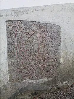Of the names in the inscription, Þorkell is a diminutive form of Þorketil, which includes as a theophoric name element the Norse pagan god Thor and means a "Vessel of Thor" or "Kettle of Thor", possibly referring to a type of sacrificial cauldron.[4] The Poetic Edda poem Hymiskviða includes a story of Thor fetching a large cauldron to brew ale. The name Þorbjôrn also refers to the Norse god and translates as "Thor Bear".[5] Although the names may refer to Norse pagan gods, this does not indicate any belief as the inscription clearly indicates a Christian faith with its cross.