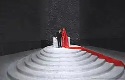 This work, which is a reenactment of the artist's own wedding ceremony, incorporates the symbolic color red, and interprets the traditional meanings of the wedding ceremony in a contemporary context. The performer playing the bride makes her appearance in a high-ceilinged gallery, which signifies the traditional authority of churches, wearing an exaggerated red 50-meter long bridal veil. The bride and groom enter the space simultaneously and equally, and follow a line of candles prepared with the help of the audience to a small central stage. Here, the ceremony is performed, integrating Western visual elements of fashion and architecture (seen) and Eastern actions of symbolic meaning (unseen). After the ceremony, the removal of the bride's veil symbolizes the discarding of restrictions and challenges society's taboos about weddings and marriage. The performers leave behind the existing strictures and seek a new liberated future outside the gallery space.