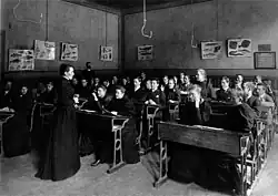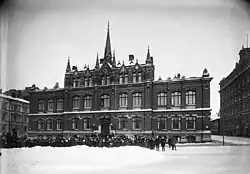 Läroverket för gossar och flickor offered nine educational levels, and from 1889 the students could complete the matriculation examination and thereby qualify for entry into university.[2] The school therefore broke new ground, since this opened the door for girls to graduate and continue their studies at a university. The school followed a curriculum with special emphasis until the Russification of Finland (1899-1905) when all school curricula were aligned.[4]