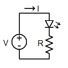 Schematic with a voltage power source (with voltage V), LED, resistor (with resistance R), and current flow (I).