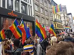 In May 2013, on the International Day against Homophobia and Transphobia and Pride, 48 cities and towns in Flanders, 7 in Wallonia and Brussels raised the rainbow flag.[27] An association of police officers known as Rainbow Cops was also introduced as part of an initiative with the Diversity Department of the National Police. Rainbow Cops Belgium are a "non-profit Association of police officers and members of the civilian staff of the Belgian Integrated Police,"[28] who aim to identify perpetrators of discrimination or hate crimes based on sexual orientation and gender identity. Raise awareness about LGBT issues in the community and within the police force; this was a means of encouraging mutual respect between the LGBT community and the police, and helping change institutional attitudes towards LGBT police officers.[28][29] This correlates with the National Plan against Homophobia, which trains police officers and magistrates to acknowledge diversity during incidences and court cases.[27]