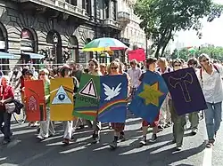 In recent years, more and more politicians have resorted to use openly homophobic rhetoric.[76] In 2014, Jobbik displayed a sign reading "The Parliament Does Not Want Any Deviants" during Budapest Pride, and verbally abused attendees and defaced posters in support of LGBTQ rights. In November 2016, it protested the painting of a fence with rainbow colours in Pomáz, even though the colouring had no connections to LGBTQ rights.[77]