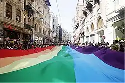 In 2003, Turkey became the first Muslim-majority country in which a gay pride march was held.[16] In Istanbul (since 2003) and in Ankara (since 2008) gay marches were being held each year with an increasing numbers of participation until 2015.[17] The gay pride march in Istanbul started with 30 people in 2003, and in 2010, there were 5,000. The pride parades in 2011 and 2012 were attended by more than 15,000 participants.