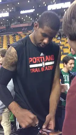Aldridge signs an autograph after a game in Boston in 2014
