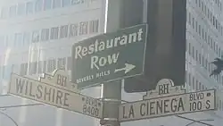 La Cienega in Beverly Hills, north of Wilshire Boulevard, is known as Restaurant Row because it features many upscale restaurants. From Wilshire in Beverly Hills traveling north the best known establishments include Benihana, The Stinking Rose, Darioush, the original Lawry's the Prime Rib, Hakobe, Tokyo Table - Tokyo City Cuisine, Matsuhisa, Fogo de Chão, Gyu-Kaku, Woo Lae Oak, The Bazaar by José Andrés, and Morton's.[1]