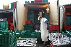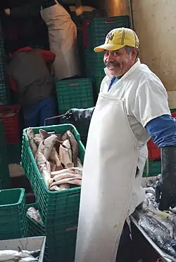 The workday starts early, at 4 AM, when trucks loaded with fresh seafood arrive.[1] Between 20,000 and 25,000 customers pass through the facility on any given day.[1][6] Many clients are restaurant owners from in and around Mexico City.[1] From 6 AM, when stalls open, to 6 PM, the market is filled with the shouts of merchants attracting customers, as well as the sounds of blades as mountains of fish and other seafood are gutted, chopped and otherwise prepared. The market employs about 7,500 people, many of whom are from coastal areas and are used to the strong odor of fish that permeates the interior.[1]