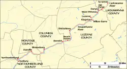 Beginning in Scranton in Lackawanna County, the Lackawanna and Bloomsburg line followed the west shore of the Lackawanna River through the Wyoming Valley, passing through Old Forge on the way to Duryea in Luzerne County. At Duryea, the Lackawanna River flows into the Susquehanna River and the railroad crossed the Susquehanna into West Pittston. The line followed the north shore of the Susquehanna River for the rest of its length, passing through Luzerne and Kingston, and crossing into Columbia County at Berwick. In Columbia County the line also passed through Bloomsburg, before crossing into Montour County and Danville there. The line ended in Northumberland in Northumberland County, where there was a connection to the Pennsylvania Railroad line. The course of the railroad is still followed closely by U.S. Route 11.
