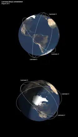 Lacrosse or Onyx was a series of terrestrial radar imaging reconnaissance satellites operated by the United States National Reconnaissance Office (NRO). While not officially confirmed by the NRO or the Government of the United States prior to 2008, there was widespread evidence pointing to its existence, including one NASA website.[1] In July 2008, the NRO itself declassified the existence of its synthetic aperture radar (SAR) satellite constellation.[2][3]
