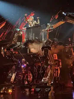 The Enigma show involves a loose storyline about "healing and finding yourself", with a setting aiming to emulate a post-apocalyptic punk environment.[11][16] A script was written by Gaga, with photographer Eli Russell Linnetz largely contributing to the creative part of the show, as well.[11] Billboard's Andreas Hale found the narrative "part Wizard of Oz and part Ghost in the Shell."[17] Gaga wanted to integrate all her past hits into the show, while also giving it "a new feel for her interpretation of a Vegas show."[11][16] The gig involves a character named Enigma, brought to life through motion capture by Gaga. Enigma was based on a character that was used during Gaga's promotional rollout for her 2013 album, Artpop, called Petga.[11] In a video posted on her social media by before the residency kicked off, Gaga referred to Enigma as her alter ego.[18] Production designer LeRoy Bennett described the show as "a journey about Gaga and her Enigma character finding themselves within each other", therefore taking place "in various settings as she's going into her virtual world and her past. But it's also the present and future, so it has to take on multiple personalities." Floating above the stage was a large light pod, which he called the "main lighting instrument" that could be interpreted as a spaceship or a cloud, or "energy beaming down on the stage to heal" Gaga.[11][16]