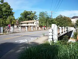 The Lafayette Street Overpass is a historic bridge in Fayetteville, Arkansas. It is a three-span reinforced concrete girder structure, carrying Lafayette Street over the tracks of the St. Louis–San Francisco Railway. The bridge is about 120 feet (37 m) long and 30 feet (9.1 m) wide, and consists of reinforced concrete spans resting on concrete abutments. It features an Art Deco railing, with a metal balustrade covering concrete piers with inset light fixtures. The bridge was built in 1938 by Edward B. Mooney, Inc.[2]