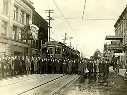 The railway's early rolling stock consisted of four 58-foot-long (18 m) passenger coaches, constructed of wood and steel, which were numbered 225, 235, 245, and 255; two control trailers numbered 265 and 275; two electric freight locomotives numbered 50 and 60; and two combination express/passenger cars numbered 209 and 219.[11] Despite this limited stock, trains were running every two hours.[16][17]