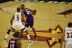 ![]() Lakers' Shannon Brown being defended by Warriors' Anthony Morrow during a 2007–08 regular season game at the Oracle Arena | |