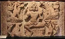 The pose is found for religious figures from Kushan art (1st to 4th century CE) from Gandhara and Mathura,[14] although at this period it is rare, with a larger number of seated Buddha images, many with crossed legs, a pose that disappears later.[15] It becomes increasing popular in the Post-Gupta period of medieval India, and has remained so, being often used in contemporary Hindu imagery in particular.