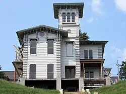 The house is a two-story frame structure in the Italian Villa style. It features a three-story tower, bracketed eaves, tall windows, and quoins on the corners. It is unknown who painted the three-story fresco in the central staircase.[8] It was painted using the trompe l'oeil style that makes the walls look like white marble with inset panels of green marble that are trimmed with wood molding. The porches added in 1925 have been removed and two small porches and a balcony have been restored. The roof is composed of a synthetic slate. A two-story addition was built onto the back house, and it has been rebuilt in the 21st-century restoration. A two-car garage that is architecturally compatible with the house was built into the hillside next to the house.